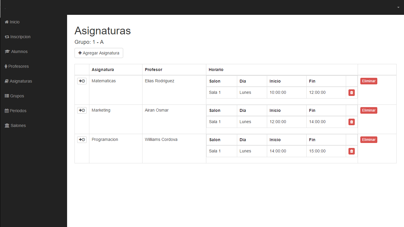 El administrador cuenta con todas las opciones del sistema, alumnos, profesores, inscripciones, materias, salones, horarios y mas.